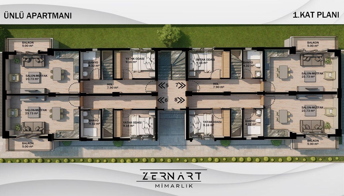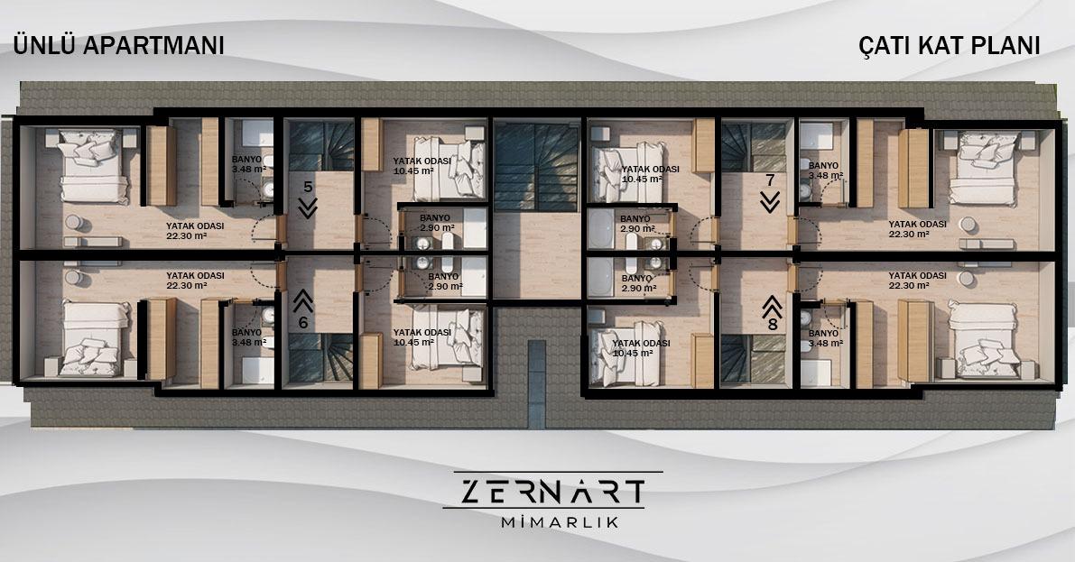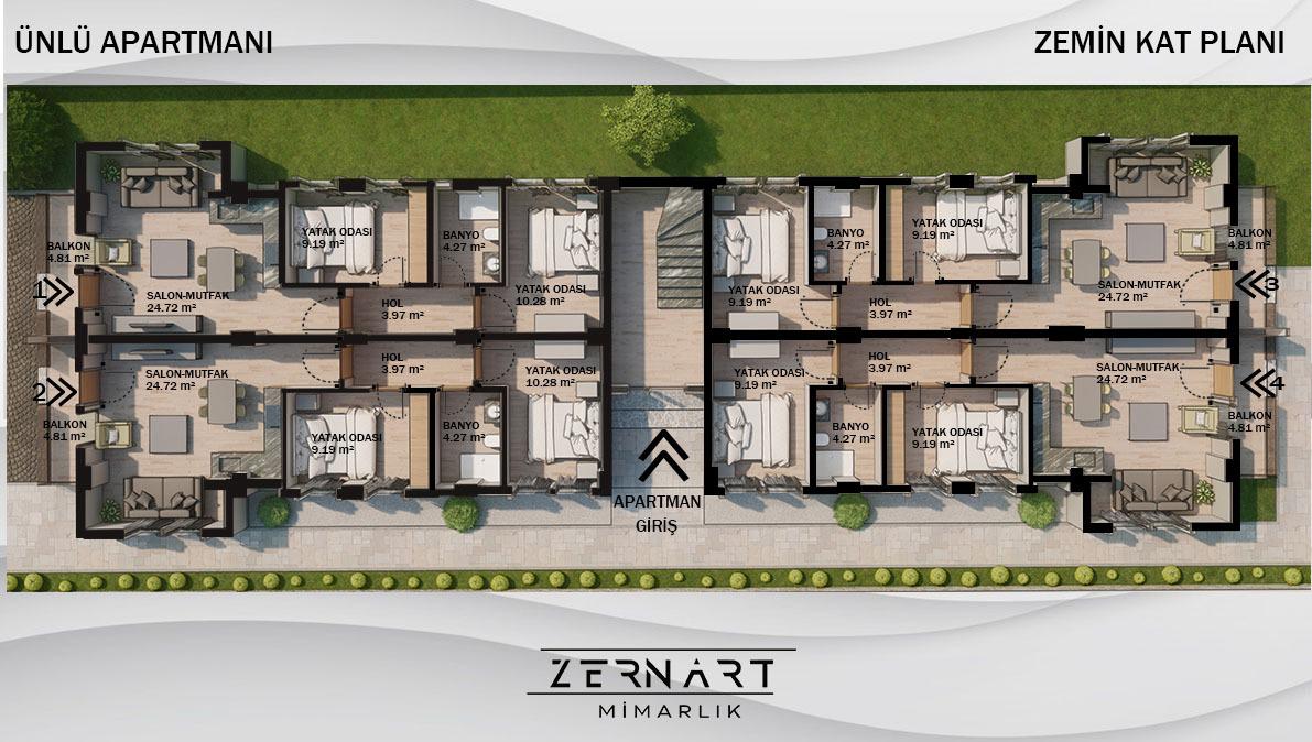 Vadi Çamköy Ünlü Apart 846 m² arsaya konumlandırılmış olup, zemin katta 4 adet bağımsız girişe sahip 2+1 daire, 1. katta ise çatı dubleks olmak üzere 4 adet 3+1 daireden oluşmaktadır.